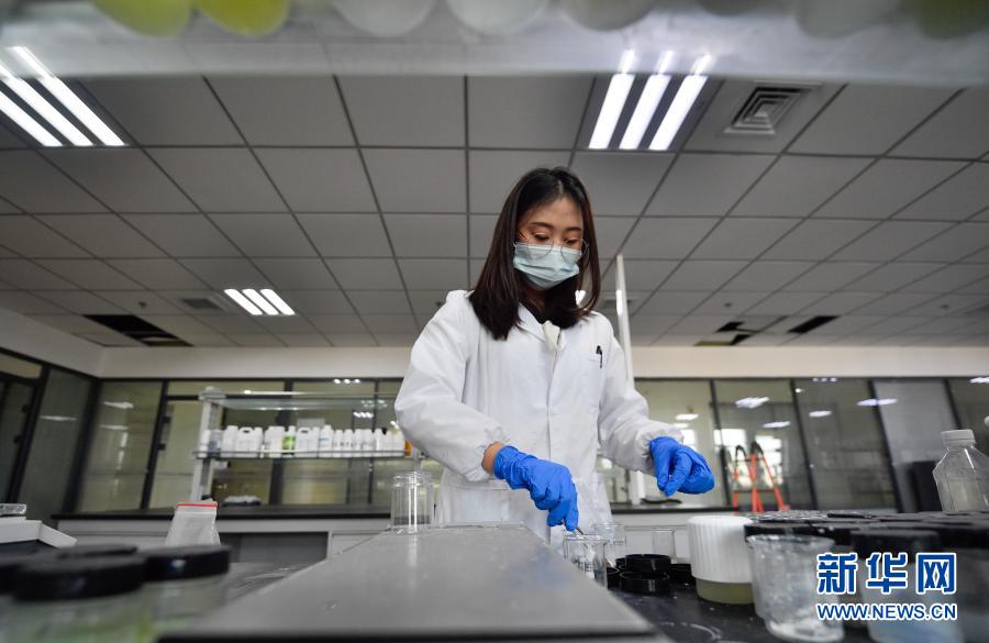 在清华大学天津高端装备研究院表界面微纳技术研究所内,科研人员在配置二氧化氯空气净化凝胶试验样品(1月15日摄)。新华社发(孙凡越 摄)