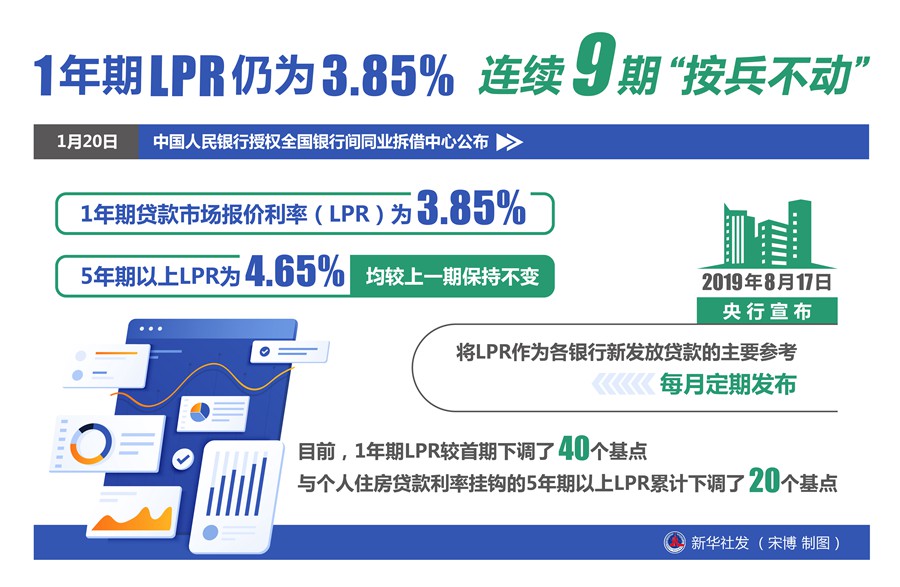 当日,中国人民银行授权全国银行间同业拆借中心公布,1年期LPR为3.85%,5年期以上LPR为4.65%,均较上一期保持不变。