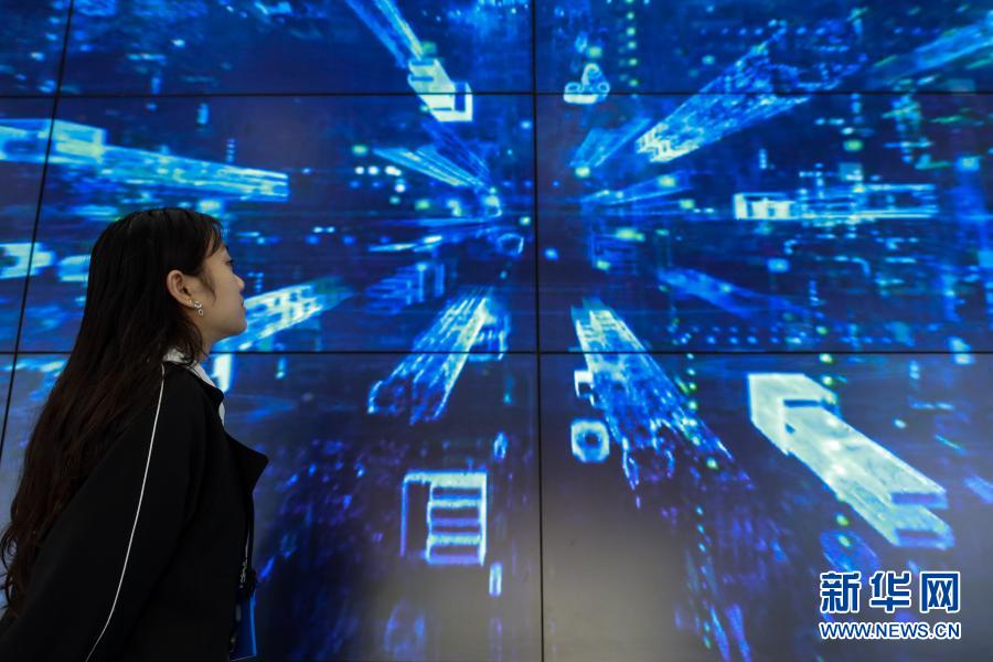 工作人员从中国电信集团公司云计算贵州信息园内的展示屏前经过(2020年4月9日摄)。新华社记者 欧东衢 摄