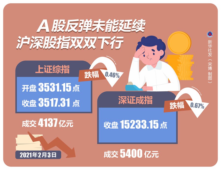 新华社上海2月3日电(记者潘清)A股近期反弹势头未能延续,3日沪深股指双双下行,中小板指数表现较弱,跌幅超过1%。两市成交继续放大,总量超过9500亿元。