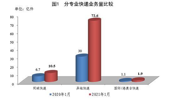 1月份,全国快递服务企业业务量完成84.9亿件,同比增长124.7%;业务收入完成867.6亿元,同比增长73.3%。其中,同城业务量完成10.5亿件,同比增长58.0%;异地业务量完成72.6亿件,同比增长141.5%;国际/港澳台业务量完成1.9亿件,同比增长69.8%。