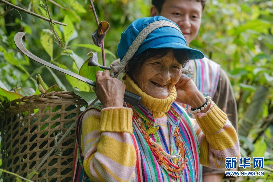 在云南省贡山独龙族怒族自治县独龙江乡孔当村,79岁的独龙族老人孔当娜割完猪草准备下山(2020年10月31日摄)。新华社记者胡超摄