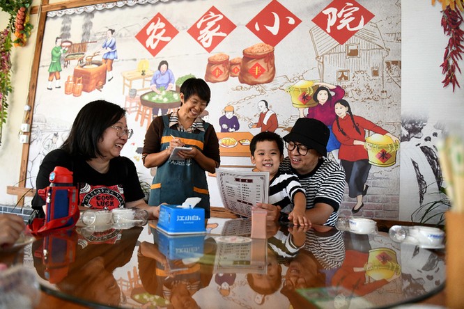 新华社照片,游客在石家庄市平山县岗南镇李家庄村一户农家乐里点菜。当地以红色旅游为核心,大力实施“旅游+发展”模式,催生出一批新景点。(2020年9月16日摄)