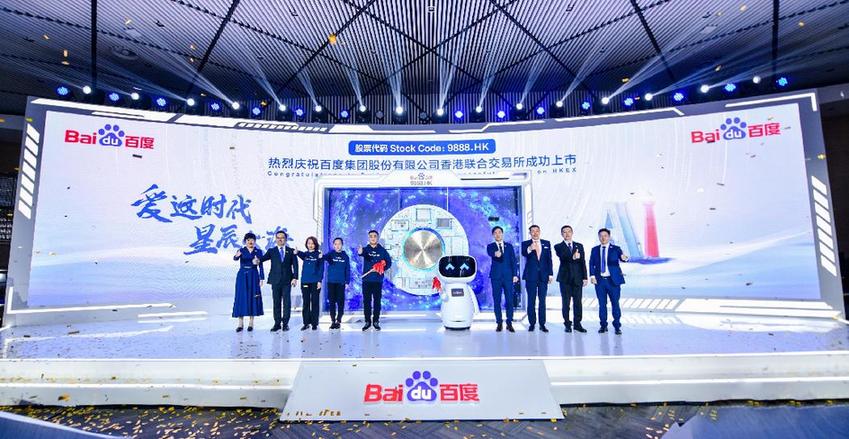3月23日,百度科技园,几位敲锣人敲响了一面附有百度自动驾驶芯片、百度昆仑芯片、百度鸿鹄芯片的“代码锣”,宣告百度集团在香港挂牌上市。敲锣人除了百度董事长兼首席执行官李彦宏等公司高层外,还包括百度数据标注师、5G云代驾安全员及百度开发者。
