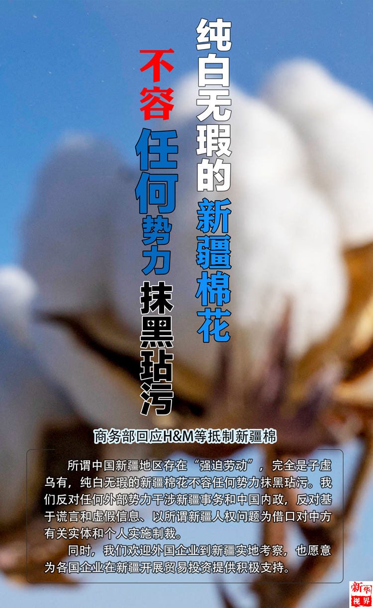 新华社北京3月25日电(记者于佳欣、王雨萧)针对H&M等品牌抵制新疆棉问题,商务部新闻发言人高峰25日回应说,所谓中国新疆地区存在“强迫劳动”,完全是子虚乌有,纯白无瑕的新疆棉花不容任何势力抹黑玷污。他还表示,欢迎外国企业到新疆实地考察。