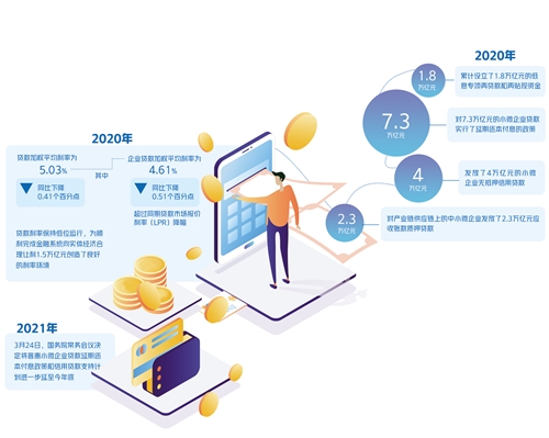 2020年,人民银行等金融管理部门创新直达实体经济和中小微企业的货币金融政策工具,累计设立了1.8万亿元的低息专项再贷款和再贴现资金,对7.3万亿元的小微企业贷款实行了延期还本付息的政策,发放了4万亿元小微企业无抵押信用贷款,对产业链供应链上的中小微企业发放了2.3万亿元应收账款质押贷款。这些政策措施一共为3200多万户中小企业和个体工商户及时给予了融资支持。