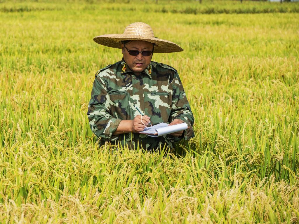 潘国君在田间工作,记录水稻生长数据。受访者供图