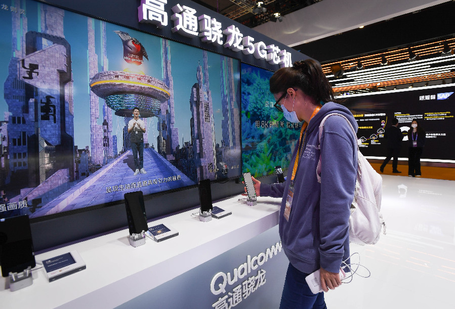 2020年11月5日,在第三届进博会技术装备展区,一名女子在高通展台体验搭载了骁龙865移动平台的5G智能手机。 新华社记者 李任滋 摄