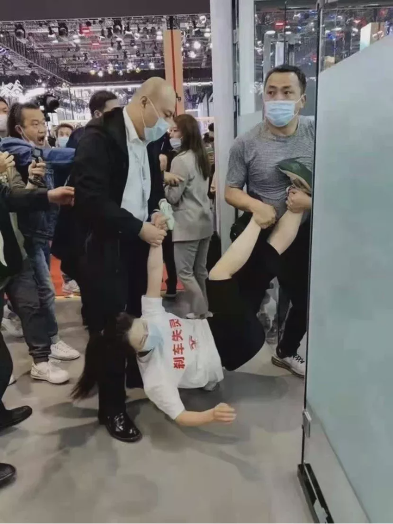 车展现场,维权者被工作人员抬走。图片来源:新浪科技