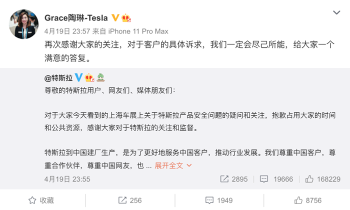 4月19日,特斯拉官方回应称,当事人为此前2月发生的河南安阳超速违章事故车主。“据了解,4月19日上午,该车主通过非常规方式获取证件进入展馆,在展台周围进行直播,露出定制维权T恤,并登上车顶大喊。现场工作人员在注意到该行为后多次言语劝解,但车主并未停止相关行为。现场工作人员在与展会主办方协商后,主办方考虑到该行为严重影响展会正常秩序,协调安保及公安执法人员劝离车主。”