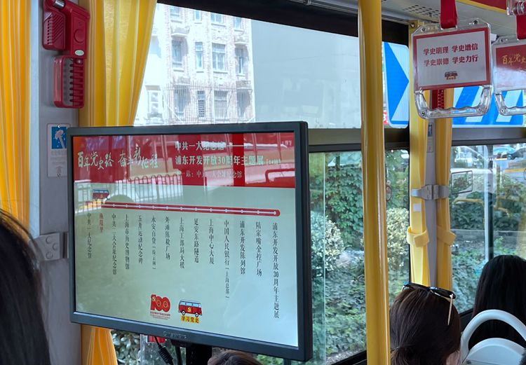 从车辆外型看,“党史巴士”采用红色涂装;巴士内部载有三块屏幕,播放着图文并茂的学习资料。