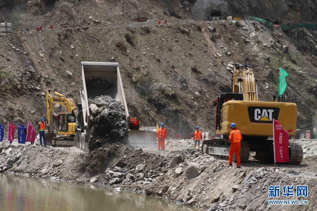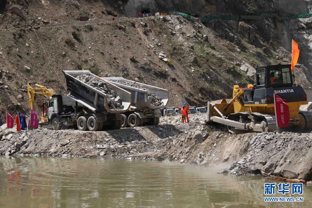 4月30日,工人在巴基斯坦曼塞赫拉的苏吉吉纳里水电站施工现场进行大坝二期截流作业。新华社记者 李浩 摄