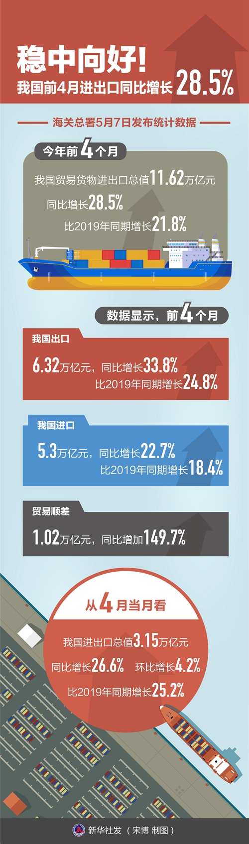 数据显示,前4个月,我国出口6.32万亿元,同比增长33.8%,比2019年同期增长24.8%;进口5.3万亿元,同比增长22.7%,比2019年同期增长18.4%;贸易顺差1.02万亿元,同比增加149.7%。