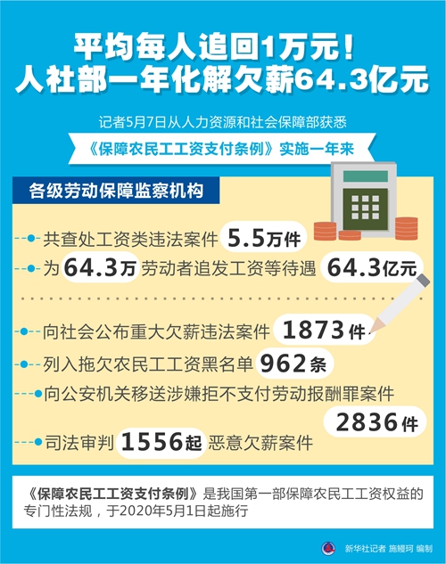 新华社北京5月7日电(记者姜琳)记者7日从人力资源和社会保障部获悉,《保障农民工工资支付条例》实施一年来,各级劳动保障监察机构共查处工资类违法案件5.5万件,为64.3万劳动者追发工资等待遇64.3亿元;向社会公布重大欠薪违法案件1873件,列入拖欠农民工工资黑名单962条,向公安机关移送涉嫌拒不支付劳动报酬罪案件2836件,司法审判1556起恶意欠薪案件。