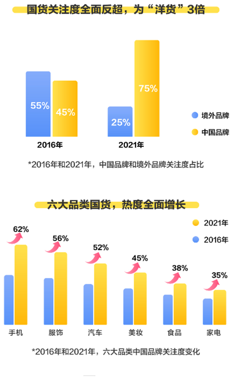 国潮的全面崛起,自然带动了国货的关注热潮。数据表明,2021年中国品牌和海外品牌的市场关注度分别为75%和25%,国货为“洋货”的3倍。在高端手机的搜索中,国产品牌同样实现了超越。5G、芯片成为热议的国产手机黑科技话题。在服饰和汽车领域,国产品牌关注度空前,品牌内涵得到全面升级。