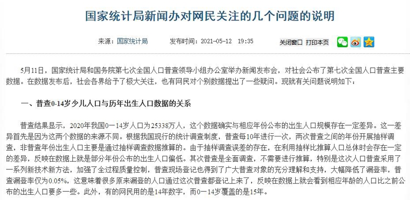 第七次全国人口普查结果显示,2020年我国0—14岁人口为25338万人,这个数据与相应年份公布的出生人口规模存在一定差异。国家统计局12日回应称,这一差异首先是因为这两个数据的来源不同。根据我国现行的统计调查制度,普查每10年进行一次,两次普查之间的年份开展抽样调查,非普查年份出生人口主要是通过抽样调查数据推算的。由于抽样调查误差的存在,在利用抽样比推算人口总体时会存在一定的差异,反映在数据上就是部分年份公布的出生人口偏低。其次普查是全面调查,不需要进行推算,特别是这次人口普查采用了一系列新技术新方法,加强了全过程质量控制,普查现场登记也得到了广大普查对象的充分理解和支持,大幅降低了漏登率,普查漏登率仅为0.05%,这意味着很多原来漏登的人口通过这次普查都登记上来了,反映在数据上就会看到相应年龄的人口比之前公布的出生人口要多一些。(记者魏玉坤)