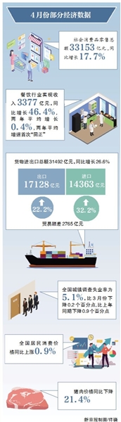 从“三驾马车”看,4月份,社会消费品零售总额33153亿元,同比增长17.7%,两年平均增长4.3%,市场销售持续恢复;货物进出口总额31492亿元,同比增长26.6%,贸易顺差2765亿元,外贸增势良好;1-4月份,固定资产投资(不含农户)143804亿元,同比增长19.9%,两年平均增长3.9%,持续恢复。
