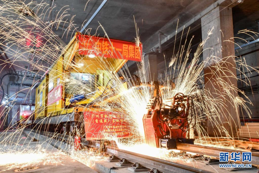 中铁十一局轨道焊机在焊接广州地铁18号线首通段最后一个钢轨接头(4月20日摄)。新华社记者 刘大伟 摄