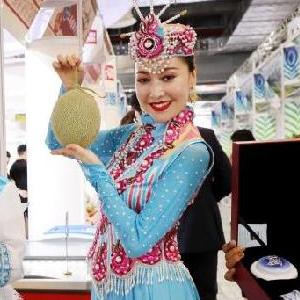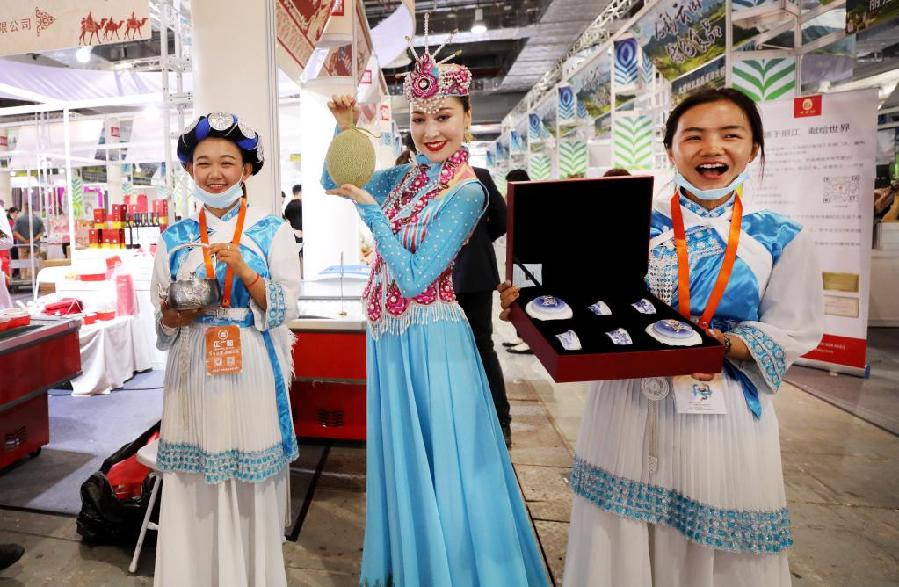 5月29日,工作人员在博览会现场手持各自企业的特色产品。新华社记者方喆 摄