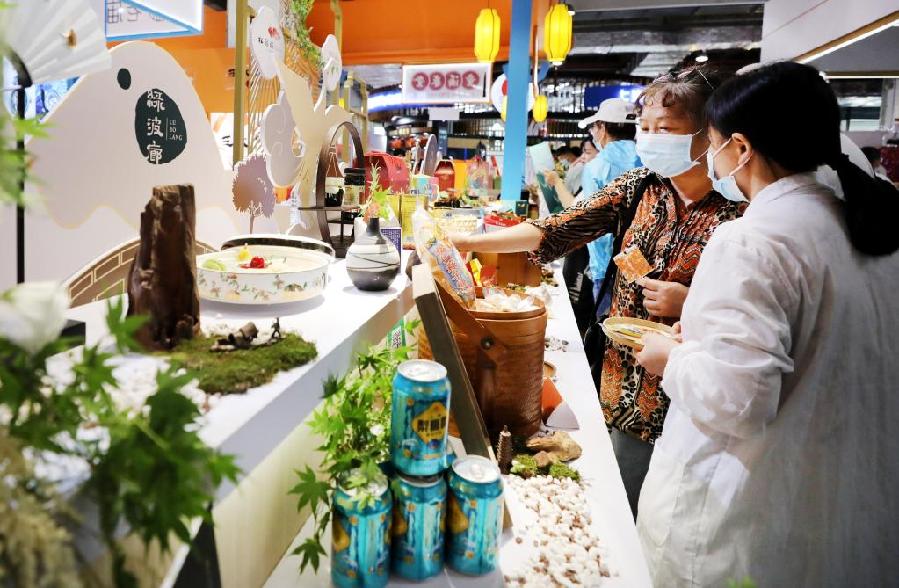 5月29日,参观者在一家豫园老字号饭店展台前挑选商品。新华社记者方喆 摄