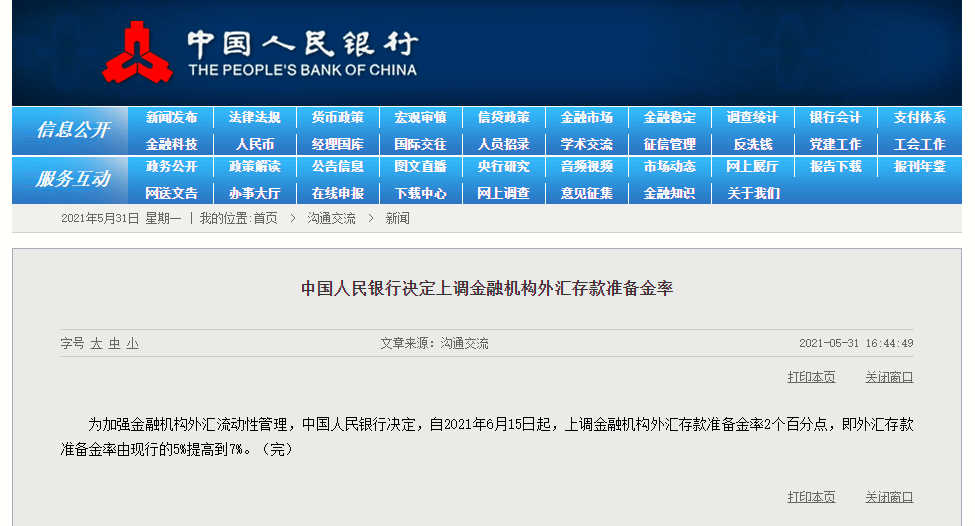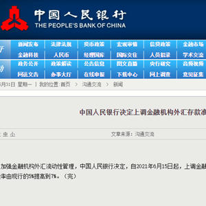 为加强金融机构外汇流动性管理,中国人民银行决定,自2021年6月15日起,上调金融机构外汇存款准备金率2个百分点,即外汇存款准备金率由现行的5%提高到7%。