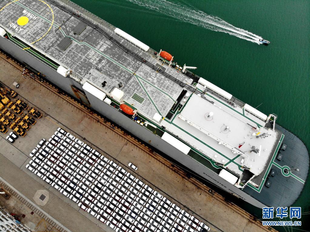 5月31日,在江苏连云港港东方公司码头,一艘滚装轮正准备装载车辆(无人机照片)。 新华社发(王春 摄)