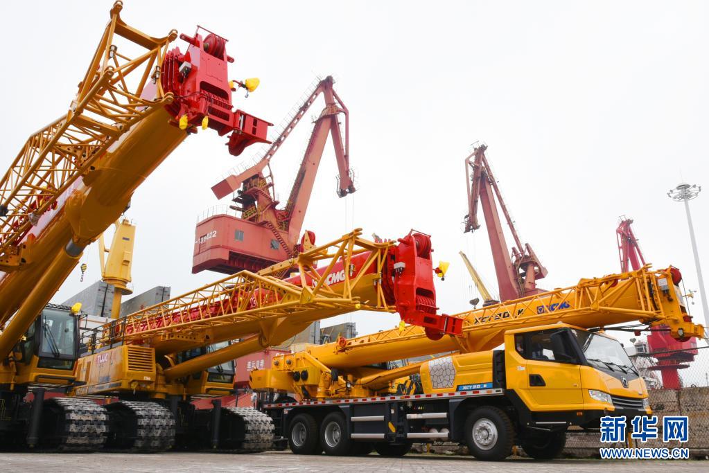 5月31日,一批工程机械设备在江苏连云港港口码头集结等待装船出口。 新华社发(耿玉和 摄)