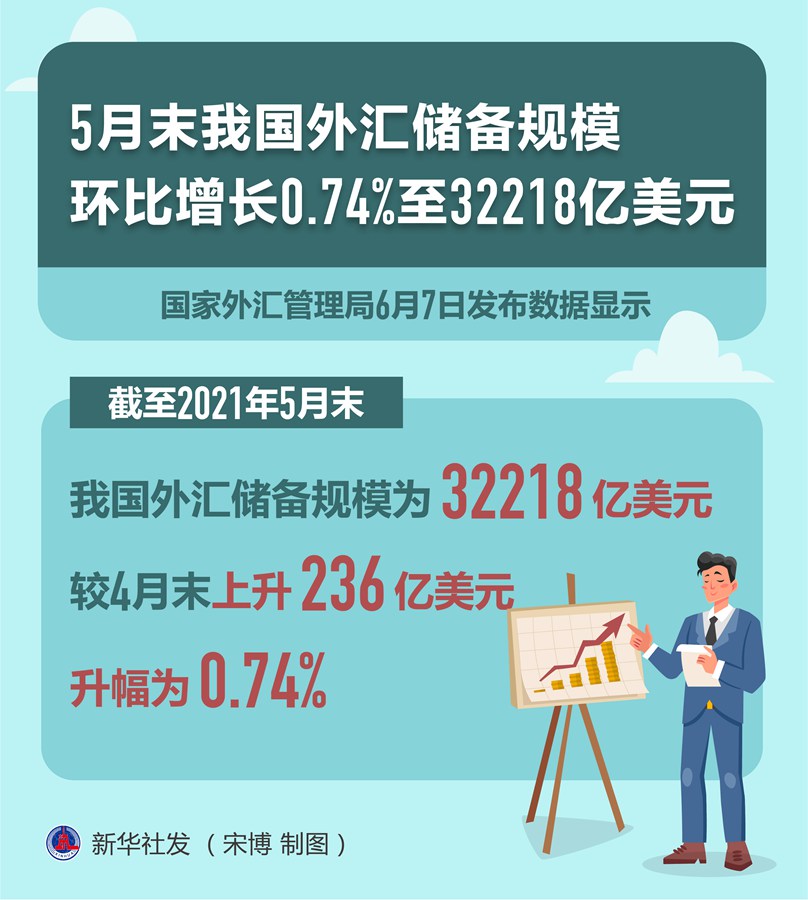 新华社北京6月7日电(记者刘开雄)国家外汇管理局7日发布数据显示,截至2021年5月末,我国外汇储备规模为32218亿美元,较4月末上升236亿美元,升幅为0.74%。