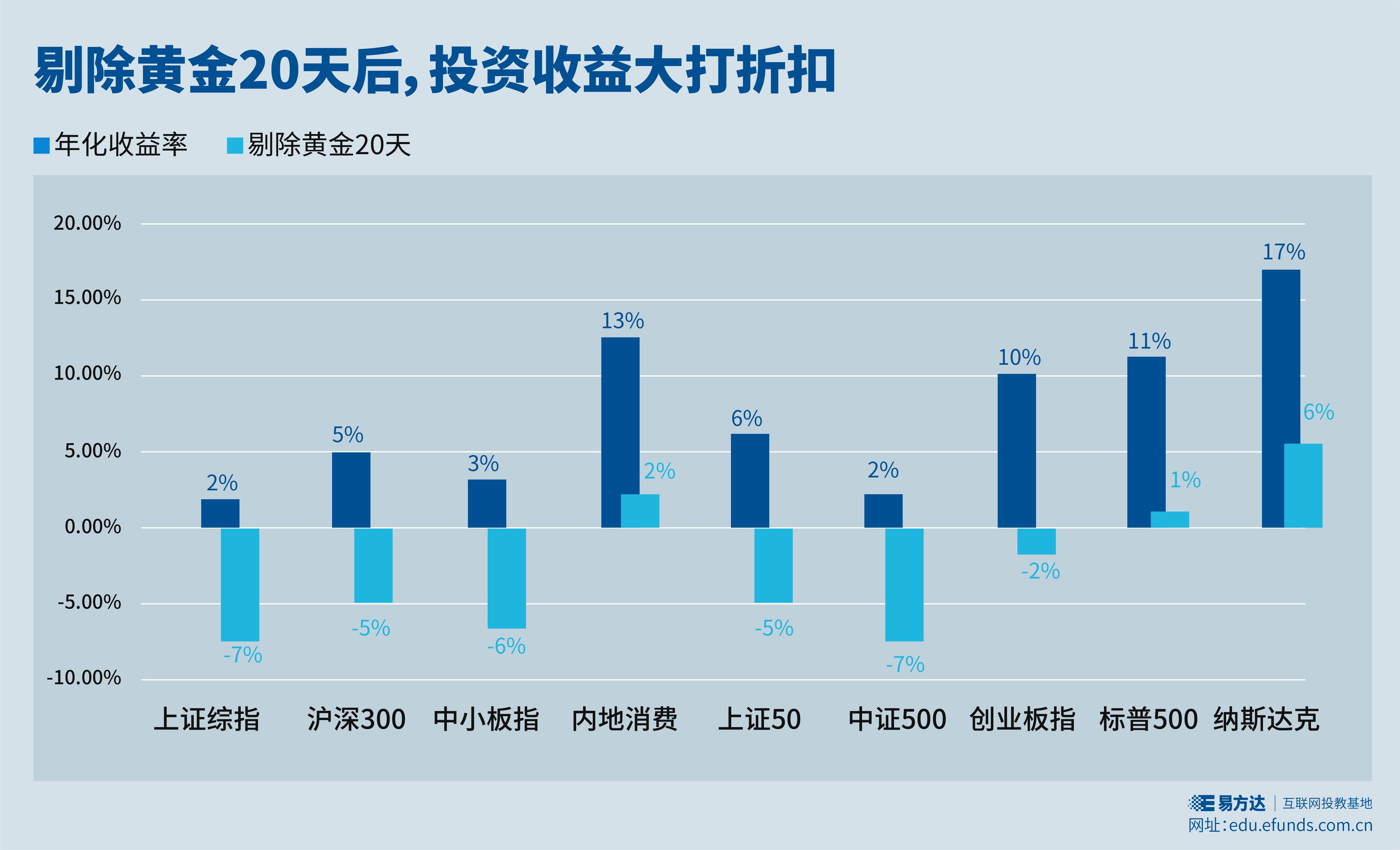 回顾2011年-2020年期间A股与美股主要指数的收益,这些指数的年化收益率多数在5%以上。但在剔除掉涨幅最好的20个交易日(称为“黄金20天”)后,指数的收益都大打折扣,甚至有些指数呈现亏损的状态。这意味着,一旦我们因为择时错过了涨幅最大的这些交易日,会对投资回报产生很大的负面影响。