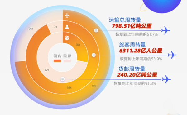 公报显示,去年全行业完成运输总周转量798.51亿吨公里,旅客周转量6311.28亿人公里,货邮周转量240.2亿吨公里。货运市场方面,完成货邮运输量676.61万吨,恢复到2019年的89.8%。分航线看,国内航线货邮运输量恢复到2019年的88.7%,国际航线恢复到2019年的92.2%,均处于较高的恢复程度。