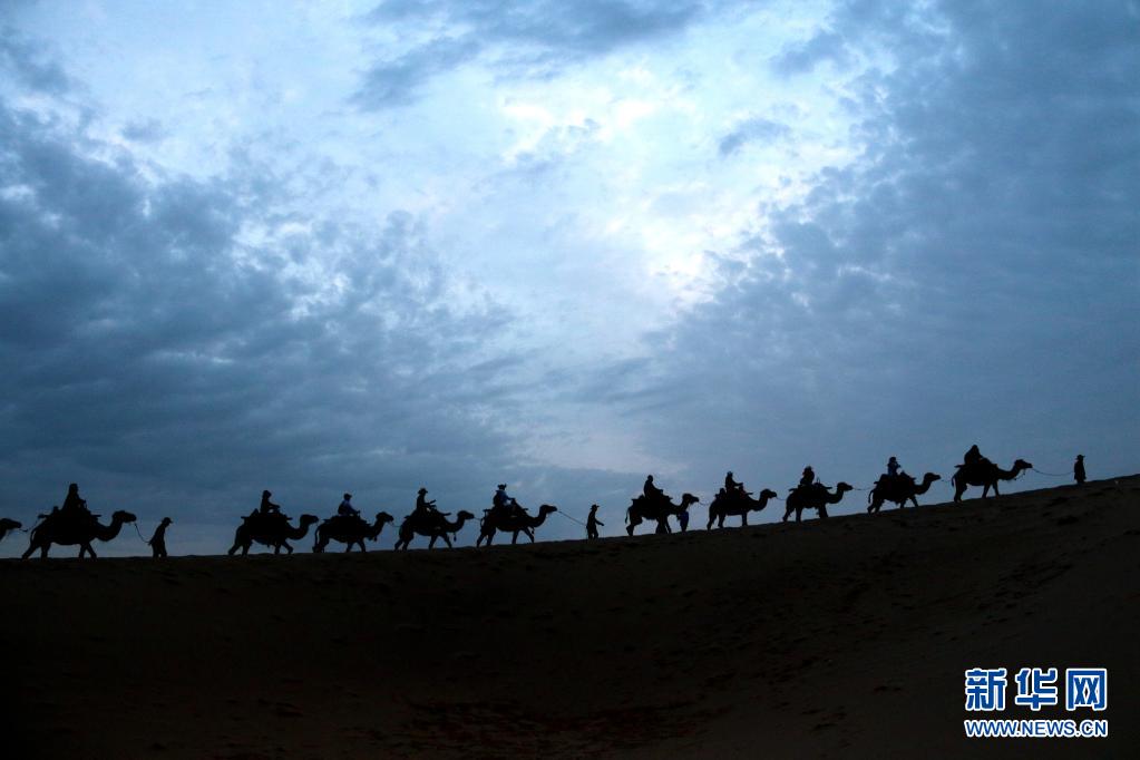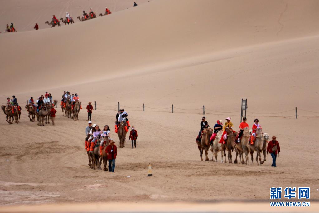 6月13日,游客在甘肃省敦煌市鸣沙山月牙泉景区游览。新华社发(张晓亮 摄)