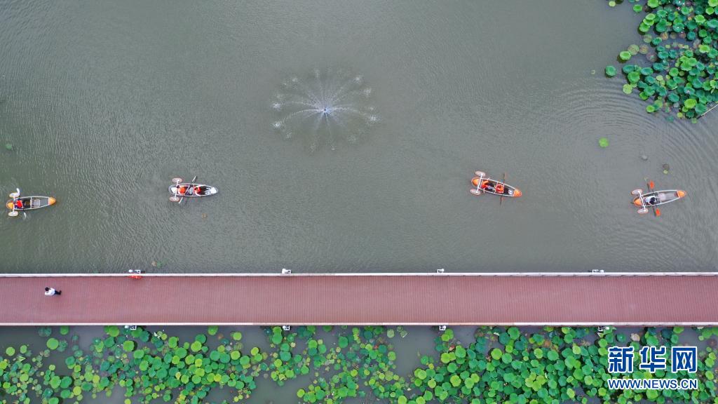 6月14日,在浙江省湖州市德清县下渚湖国家湿地公园,游客划船欣赏盛开的荷花(无人机照片)。新华社发(谢尚国 摄)