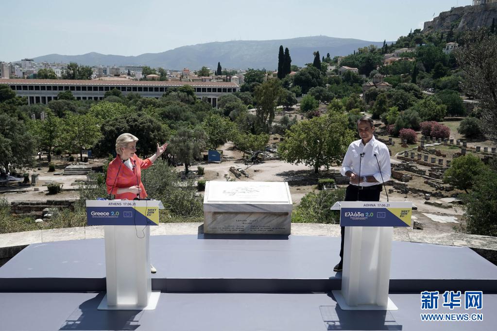 6月17日,欧盟委员会主席冯德莱恩(左)在希腊雅典和希腊总理米佐塔基斯举行联合新闻发布会。新华社发(迈内劳斯·米里勒斯摄)