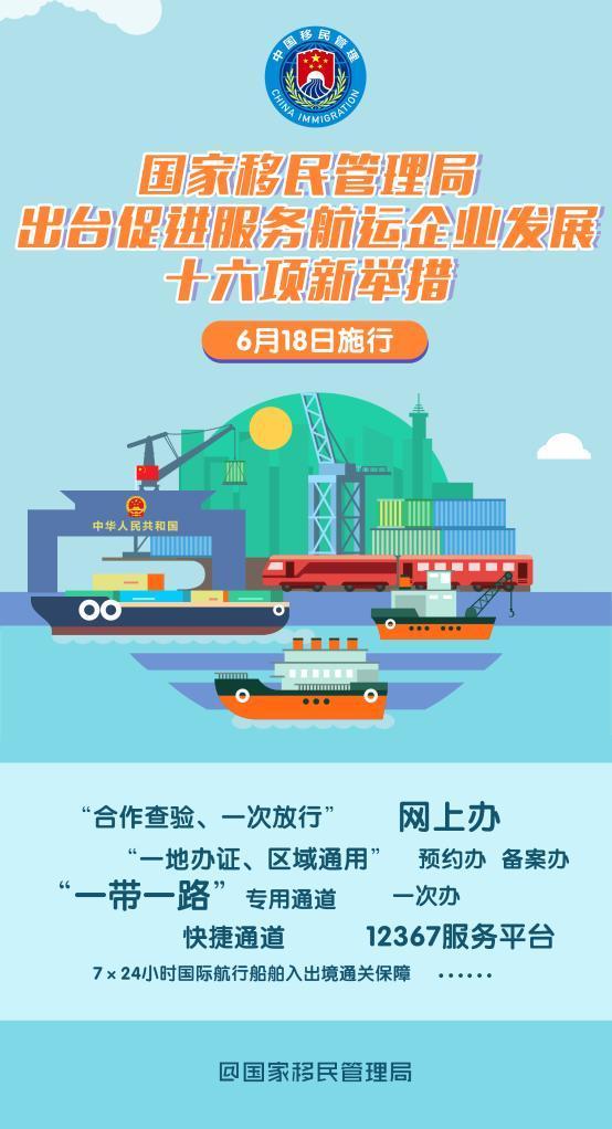 新华社北京6月18日电(记者任沁沁)国家移民管理局18日发布促进服务航运企业发展十六项新举措,并从当日起施行,进一步优化口岸营商环境,激活市场主体活力。