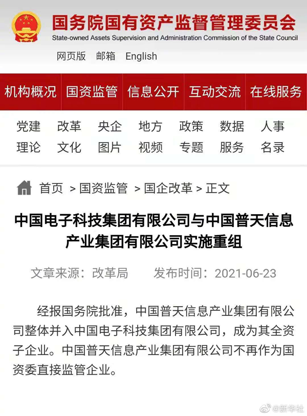 中央企业重组整合再下一城!国务院国资委网站23日发布消息,经报国务院批准,中国普天信息产业集团有限公司整体并入中国电子科技集团有限公司,成为其全资子企业。中国普天信息产业集团有限公司不再作为国资委直接监管企业。(记者王希)