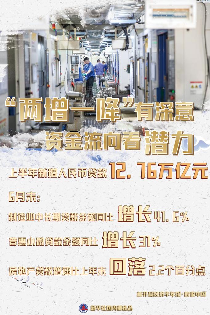 企业实现蓝图需要资金支持,百姓满足需求离不开金融服务。上半年,我国人民币贷款增加12.76万亿元,其中制造业中长期贷款和小微企业贷款增长明显,房地产贷款增速持续走低。在“十四五”开局之年,这“两增一降”具有深意。在金融活水的灌溉下,中国经济行稳致远的潜力清晰可见。