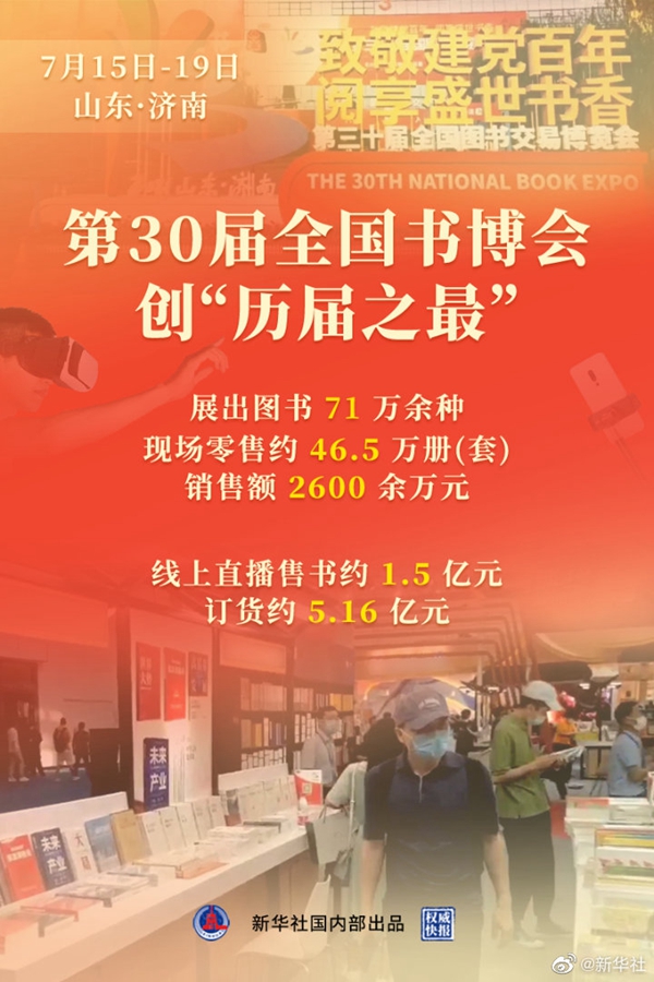 第30届全国图书交易博览会期间,共展出图书71万余种,现场零售图书约46.5万册(套),销售额2600余万元;线上直播售书约1.5亿元;实现馆配和民营订货约5.16亿元,吸引读者60余万人次。参展数量和规模创历届之最,“线上书博”“云逛展”“直播带货”等首次在全国书博会上亮相,营造出浓厚的阅读氛围。(记者史竞男、萧海川,海报设计:杨轶群)