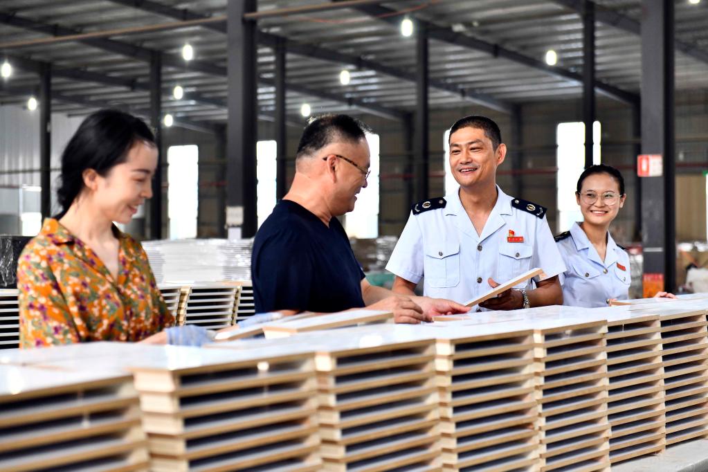 6月16日,在菏泽金然木制品有限公司,曹县税务局的工作人员上门走访,介绍出口退税相关优惠政策。新华社记者 郭绪雷 摄