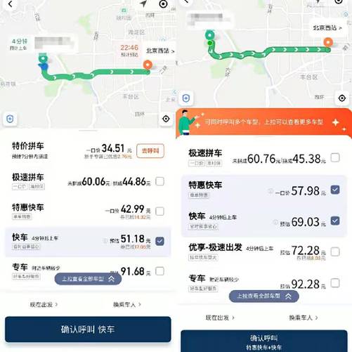 ——记者在某网约车平台上搜索发现,在同一时间于同一地点出发至北京西站,经常使用该网约车平台的用户手机内显示的快车打车费用预估为69.03元。但不经常使用该平台的用户手机上显示,打车费用预计为51.18元,其中包含了17.05元被抵扣的优惠券。但记者发现,即便不选择使用优惠券抵扣车费,不经常使用该平台的用户打车费用是68.23元,比常用用户显示的车费还便宜0.8元。