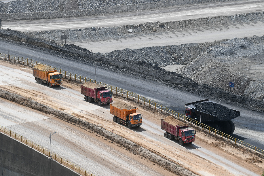 卡车在内蒙古鄂尔多斯市准格尔旗黑岱沟露天煤矿内作业。新华社 贝赫 摄