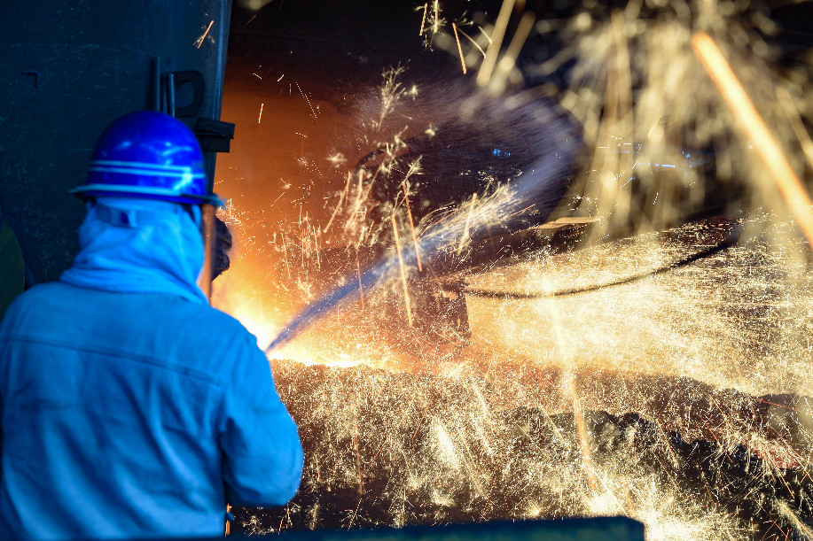 工人在首钢水钢公司铁焦事业部四号高炉出铁水时洒水降尘。新华社 邓刚 摄