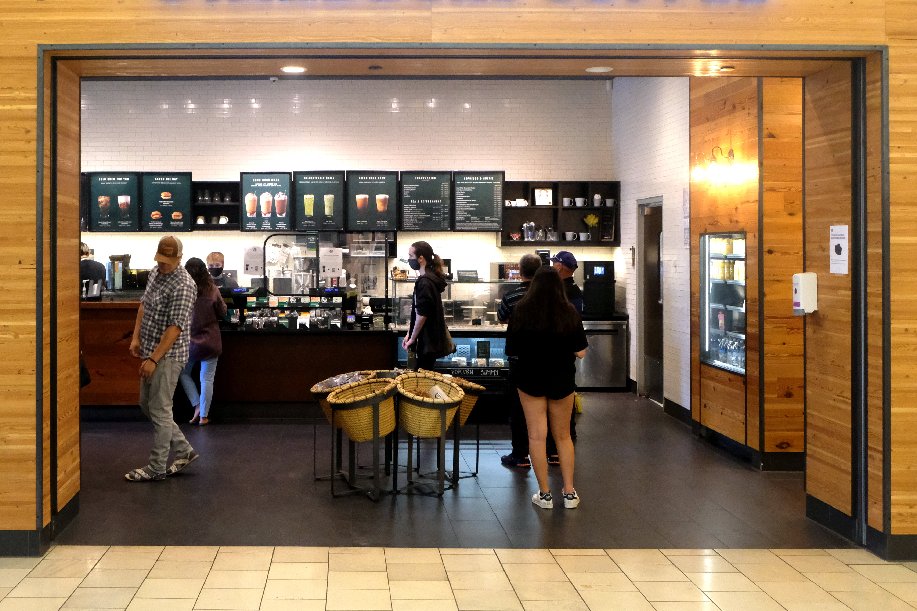 7月21日,顾客在美国旧金山湾区城市圣马特奥一处购物中心内的咖啡店排队。据英国《金融时报》网站报道,美国消费者对经济的信心减弱,越来越担心加速上涨的物价,对经济复苏前景感到悲观。继前一个月上涨5%之后,6月消费者价格指数同比猛涨5.4%,创下13年来的新高。新华社 吴晓凌 摄