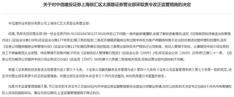 2021年11月,中国证监会网站公布了一则上海监管局对中信建投证券一营业部采取责令改正监管措施的决定。该营业部“在开展融资融券业务过程中存在为客户两融绕标等不正当的交易活动提供便利的情形”。