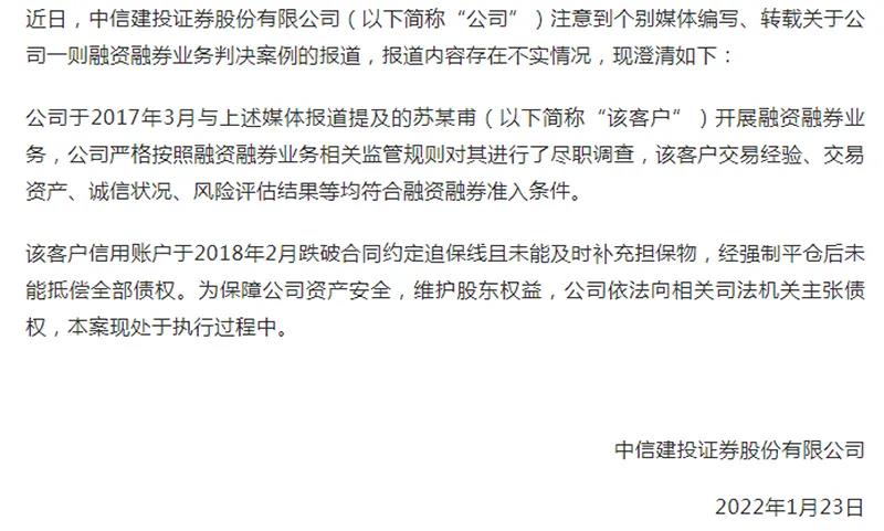 中信建投证券昨晚也就此发布澄清声明,2017年3月与该客户开展的融资融券业务,公司严格按照融资融券业务相关监管规则进行了尽职调查,该客户交易经验、交易资产、诚信状况、风险评估结果等均符合融资融券准入条件。