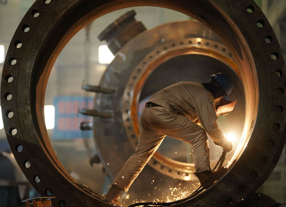4月14日,在哈电集团哈尔滨锅炉厂有限责任公司车间,工人在进行生产作业。 新华社记者王建威摄