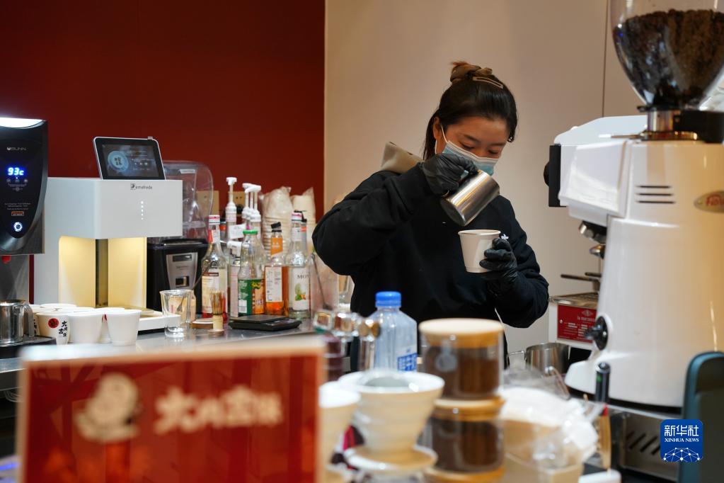 1月31日,“大内·宫保”咖啡店的店员在制作咖啡。 新华社记者 魏弘毅 摄