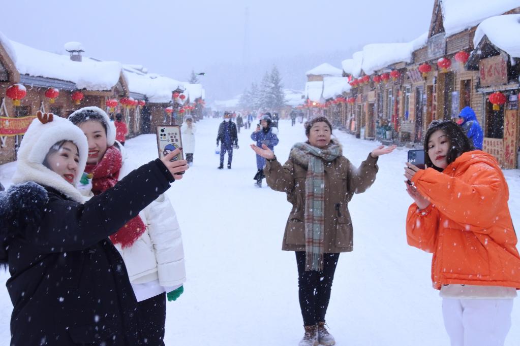 2月10日,游客在中国雪乡游览拍照。新华社发(张春祥摄)