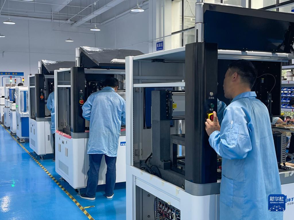 武汉普赛斯电子股份有限公司的生产人员对大功率VCSEL晶圆测试系统进行装配调试(2023年5月10日摄)。新华社发(铁艺凝 摄)