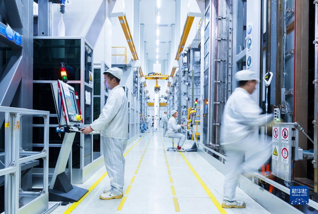 工人在亨通集团绿色光纤预制棒智能制造生产车间忙碌(2022年10月摄)。新华社发(亨通集团供图)
