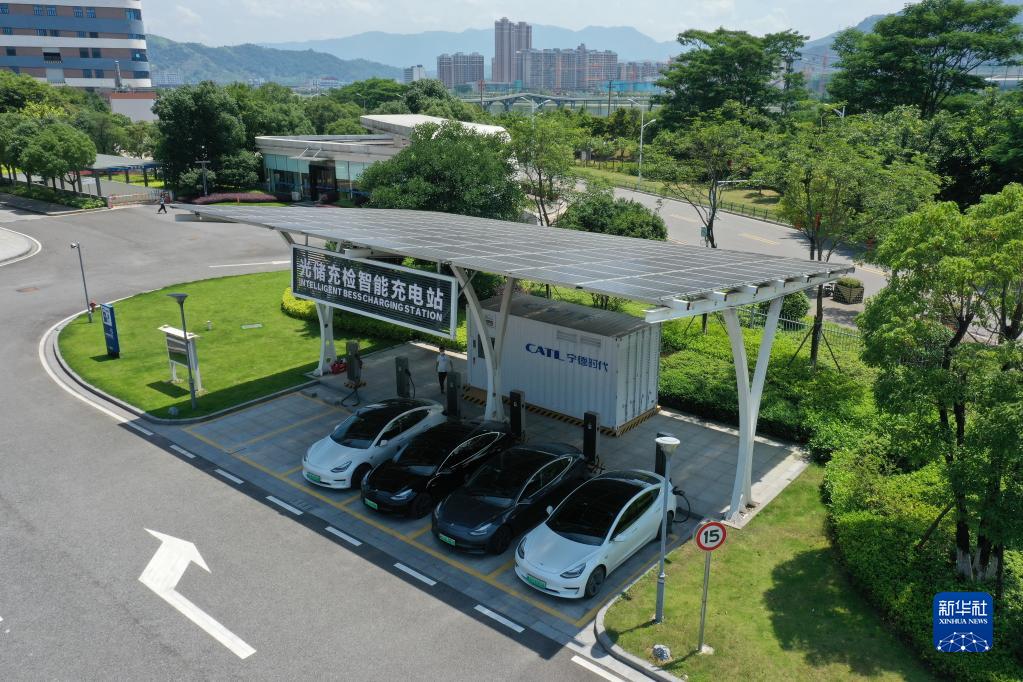在宁德时代新能源科技股份有限公司科技大楼前拍摄的光储充检智能充电站(2022年6月24日摄,无人机照片)。新华社记者 林善传 摄